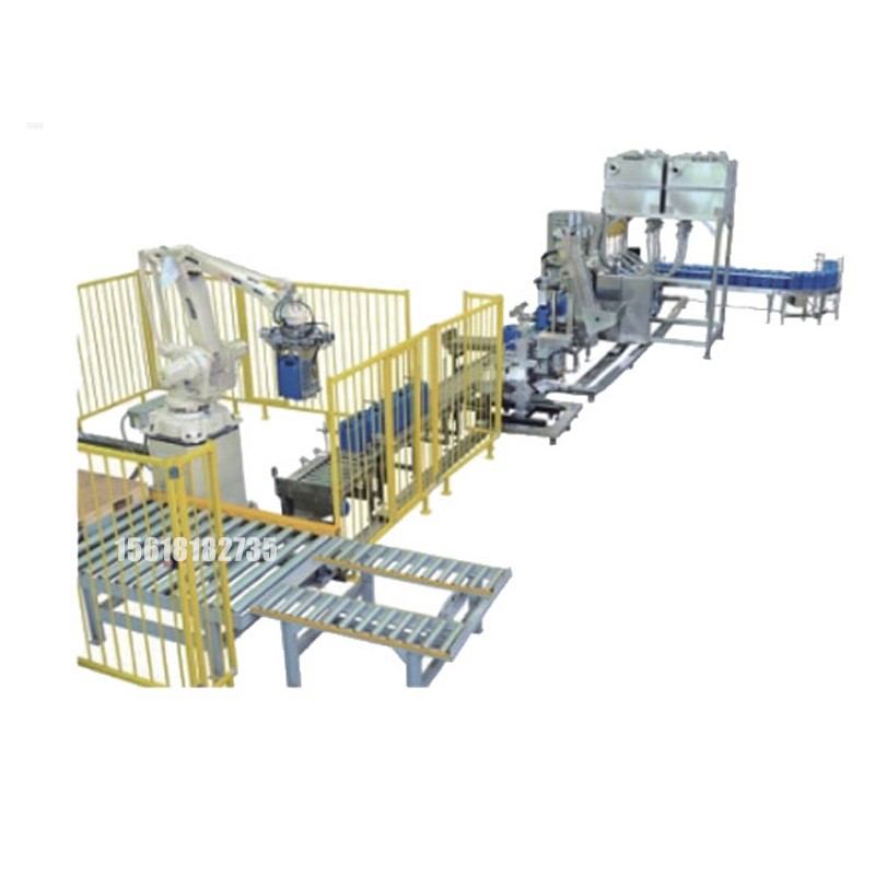 自動(dòng)上桶分桶→自動(dòng)對(duì)孔→自動(dòng)灌裝→自動(dòng)放蓋壓蓋→自動(dòng)貼標(biāo)→人工碼垛→自動(dòng)纏繞膜